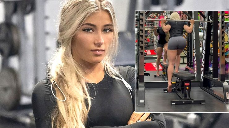 “If you wanna grow your glutes, raise the bar up to the top and secure it,” demonstrates Bowlby. This should place the bar at around shoulder height but you may need to use a different rung necessary. “Pull a bench into the smith machine, this will take some adjusting because we’re targeting glutes,” says the super-fit social media star. To get into position, the Bowlby places the bench so that her working leg is under the center of the smith bar. As she lifts, the coach adds; “You’re gonna want the non-working leg hanging off the bench. Keep your back straight, and hinge at your hips, driving through the foot on the bench, keeping all the tension on your working leg.”