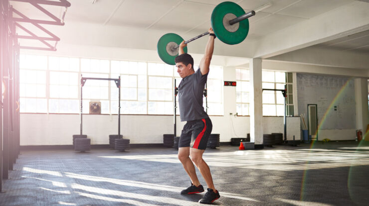 The barbell push press uses a lower-body dip, think quarter squat with knees going over toes to push the barbell overhead. This is not two movements but one seamless movement. You use your lower body to press the barbell overhead. The push press uses a triple extension of the ankles, knees, and hips, which closely mimics what a lot of overhead athletes do and most sports that involve running.